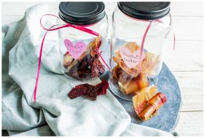 Sibylle’s Tipp: Um Schimmelbildung bei Fruchtleder von Anfang an auszuschließen, kann die Fruchtmasse mit Agar-Agar (Bioladen oder Reformhaus) oder Leinsamen angedickt werden. Dies verteilt die enthaltene Feuchtigkeit etwas gleichmäßiger.